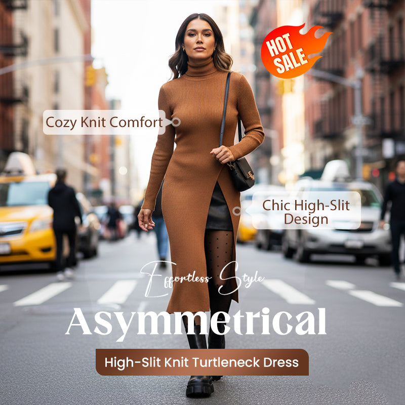 Asymmetrical High-Slit Knit Turtleneck Dress