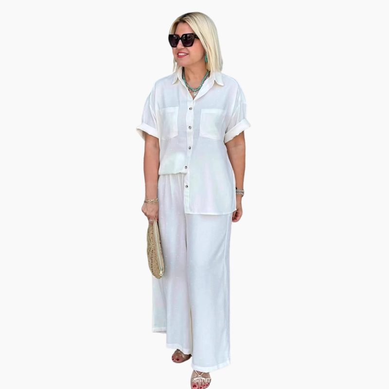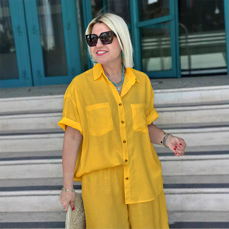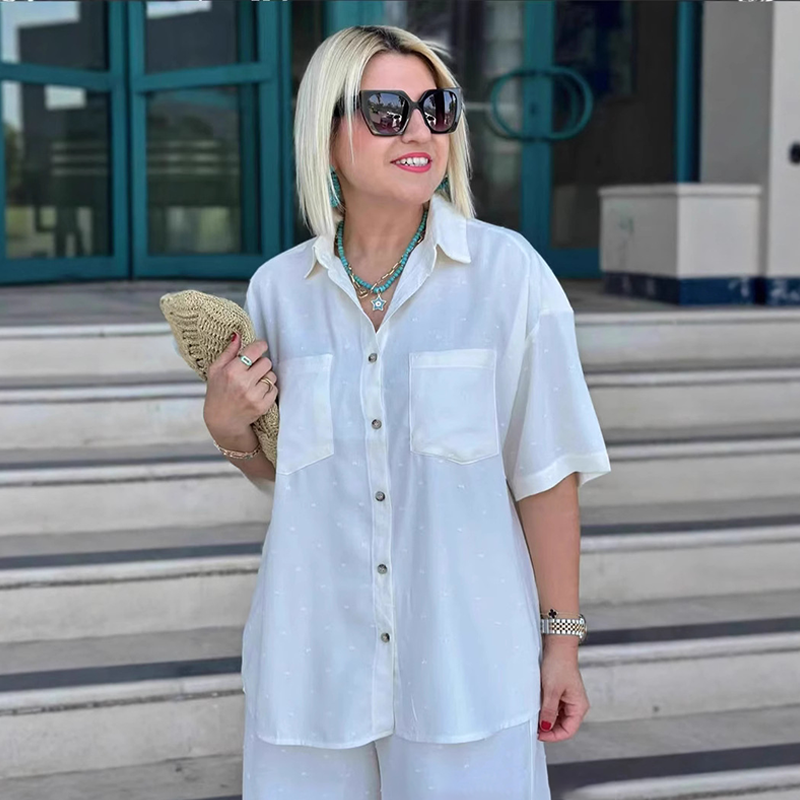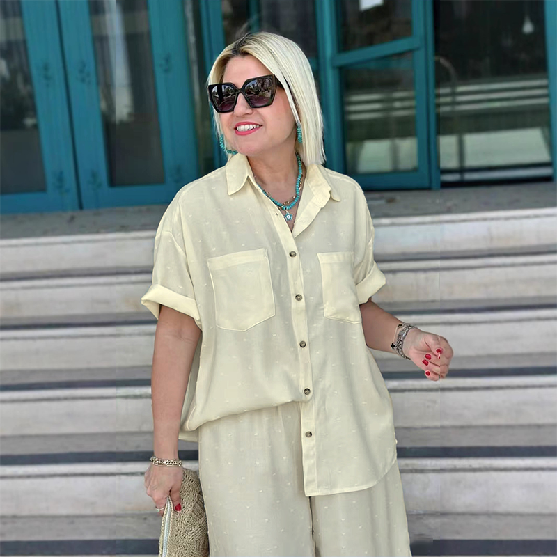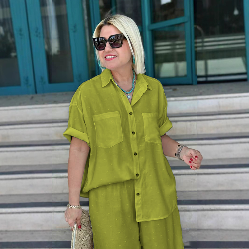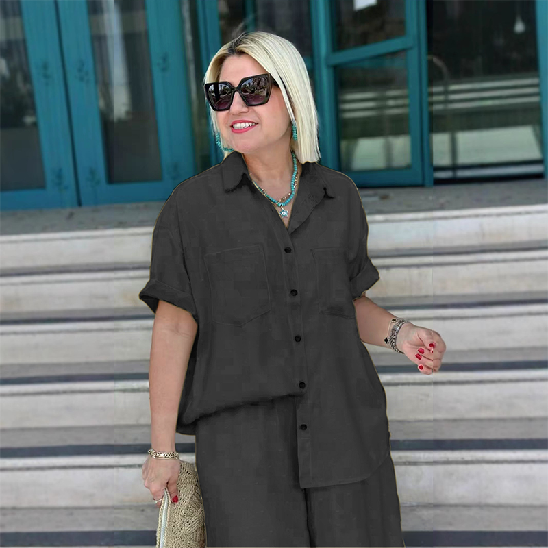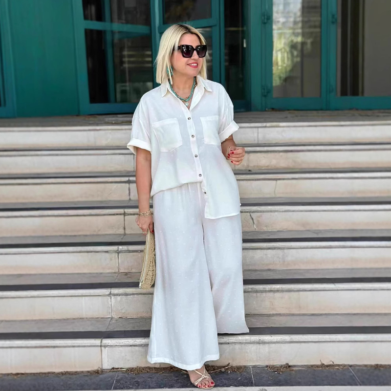 Breathable Solid Color 2-Piece Set - Short-Sleeved Collared Shirt & Wide-Leg Pants