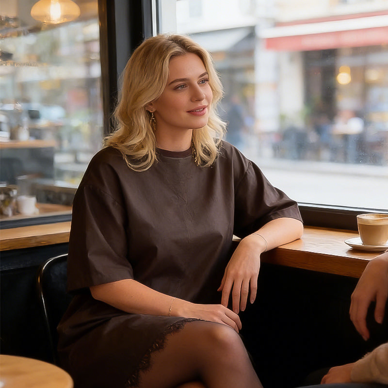 DELICATE LACE HEM - Adds a touch of feminine elegance to the casual silhouette. This intricate detailing elevates the simple t-shirt dress, making it suitable for both day-to-night transitions with effortless style.