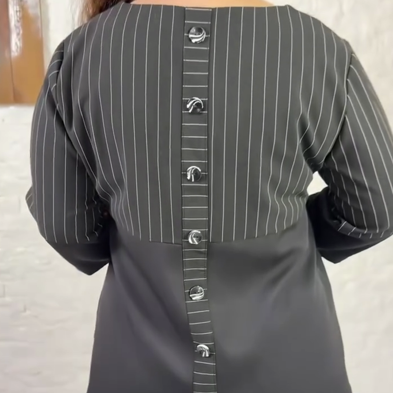 FUNCTIONAL DESIGN DETAILS: The right-side pocket on the top, made from the same striped fabric, blends into the overall aesthetic while adding practicality. It’s a subtle yet effective way to enhance the outfit without compromising on usability.