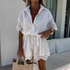 Chic Embroidered Lace Flowers Button Up Belted Shirt Romper