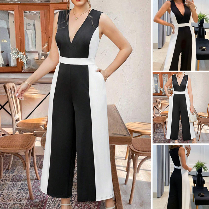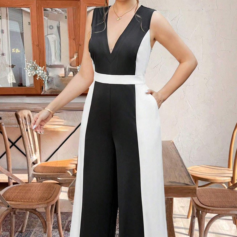1 * Elegant Black & White Contrast V-Neck Sleeveless Wide-Leg Jumpsuit