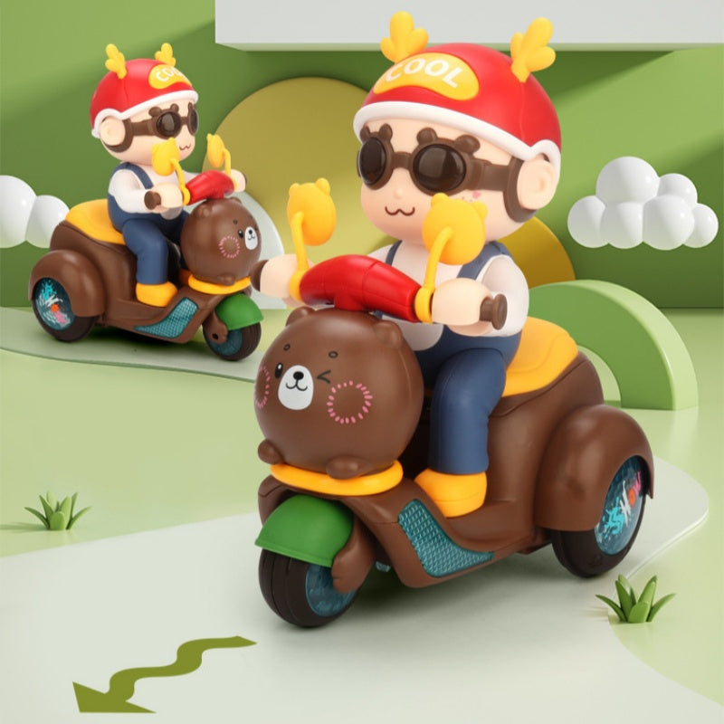 The tricycle’s bottom stand lifts the front wheel after moving a certain distance, enabling a 360° fast spin. It’s an attention-grabbing trick that kids will love!