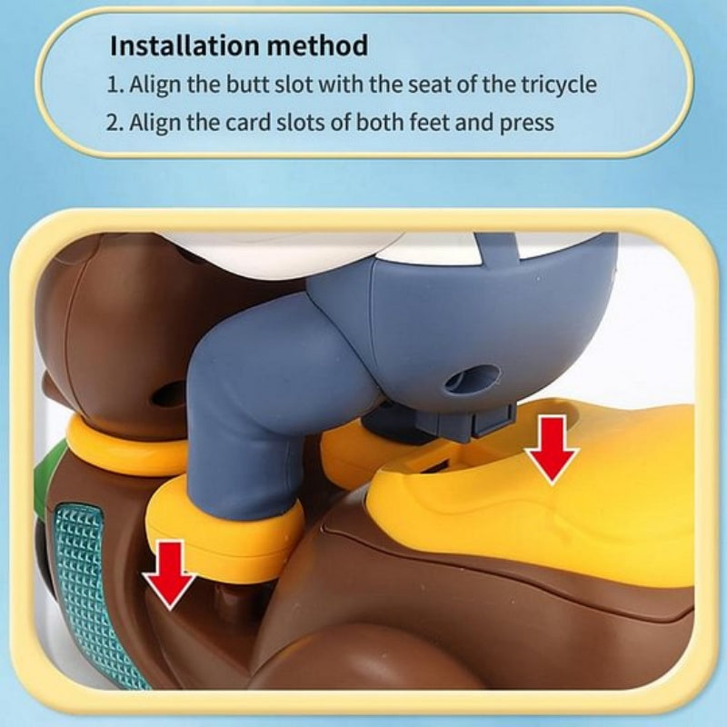 Simply align the toy character’s seat and foot slots with the tricycle and press firmly to secure. The battery compartment is hidden in the seat, maintaining the toy’s sleek look.