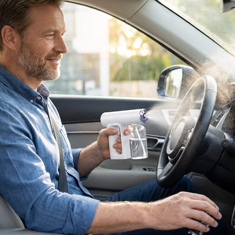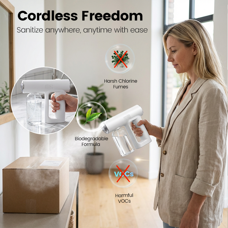 NANO ATOMIZATION TECHNOLOGY - Produces an ultra-fine, dry mist that covers large areas quickly and evenly. It ensures deep sanitization of surfaces and air without leaving wet residue, making it safe for electronics and fabrics.