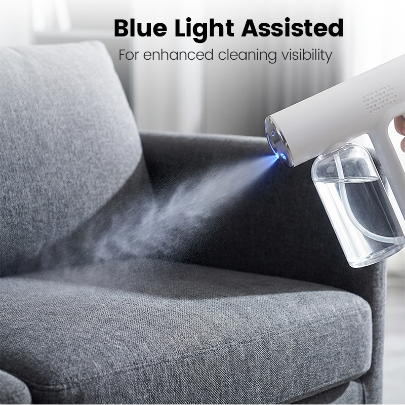 BLUE LIGHT ASSISTANCE - Equipped with powerful blue lights that operate with the sanitizing mist. This feature provides targeted guidance and enhances the overall cleaning process, helping you visibly confirm coverage areas for a more thorough clean.