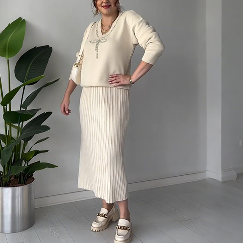 Women's Elegant Rhinestone Bow Two-Piece Sweater & Skirt Set