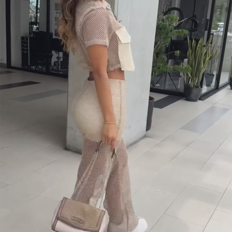 Package Includes: 1*Women's Cropped Top & Patchwork Mesh Panel Trousers Set