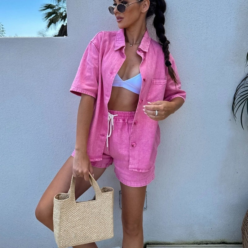 DRAWSTRING SHORTS – ADJUSTABLE COMFORT FOR ANY OCCASION: The matching shorts come with a practical drawstring waistband, allowing for easy adjustments and a secure fit. The comfortable mid-rise design and soft denim fabric offer unrestricted movement, making it perfect for warm weather and all-day wear.
