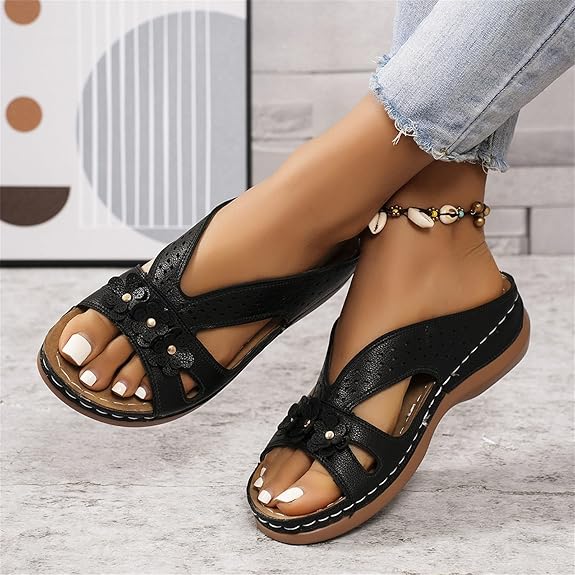 BREATHABLE DESIGN, ALL-DAY SUPPORT – Perforated leather accents and open-toe construction keep feet cool, even in summer heat. Lightweight rubber sole molds to your stride, offering arch support and shock absorption. Dance, explore, or relax—your feet stay fresh from dawn to dusk.
